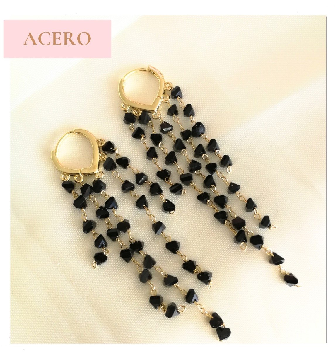 ARETES DORADOS CON PIEDRAS NEGRAS EN ACERO