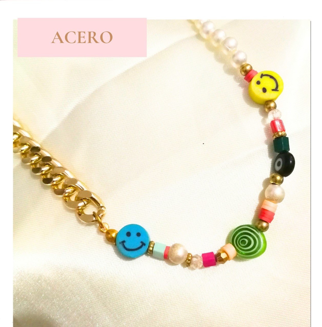 COLLAR DE PERLAS Y CARITAS FELIZ EN  ACERO