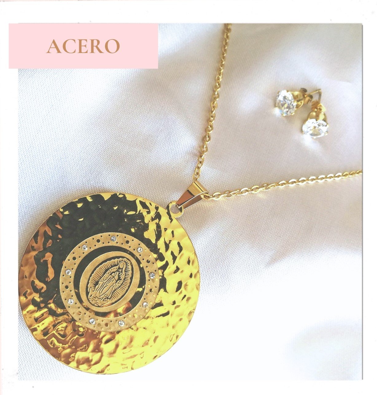 JUEGO DE ARETES Y COLLAS DORADO CON DIJE DE LA V. DE GUADALUPE EN ACERO