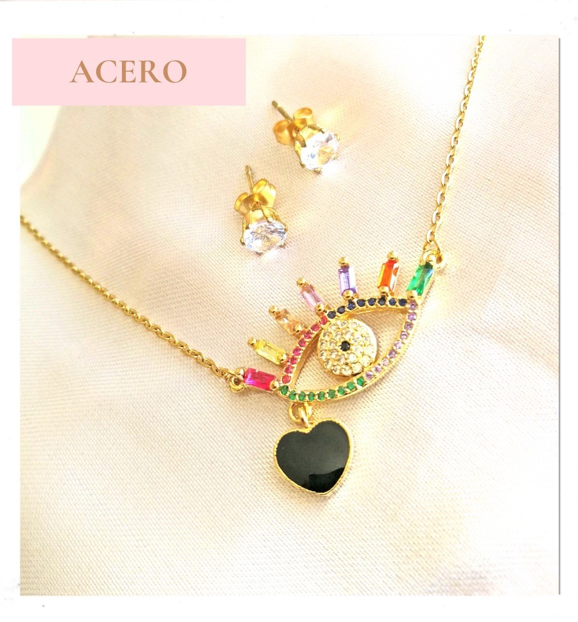 JUEGO DE ARETES Y COLLAR DORADO CON DIJE DE OJO DE COLORES EN ACERO