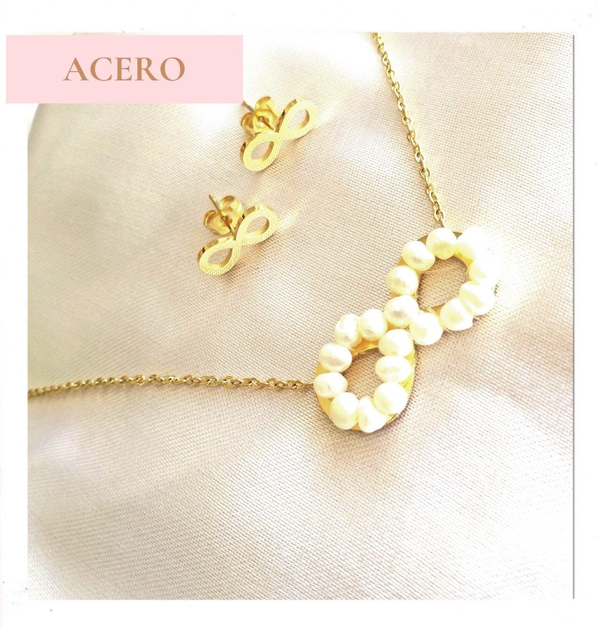 JUEGO DE ARETES Y COLLAS DORADO CON DIJE DE INFINITO CON PERLAS EN ACERO