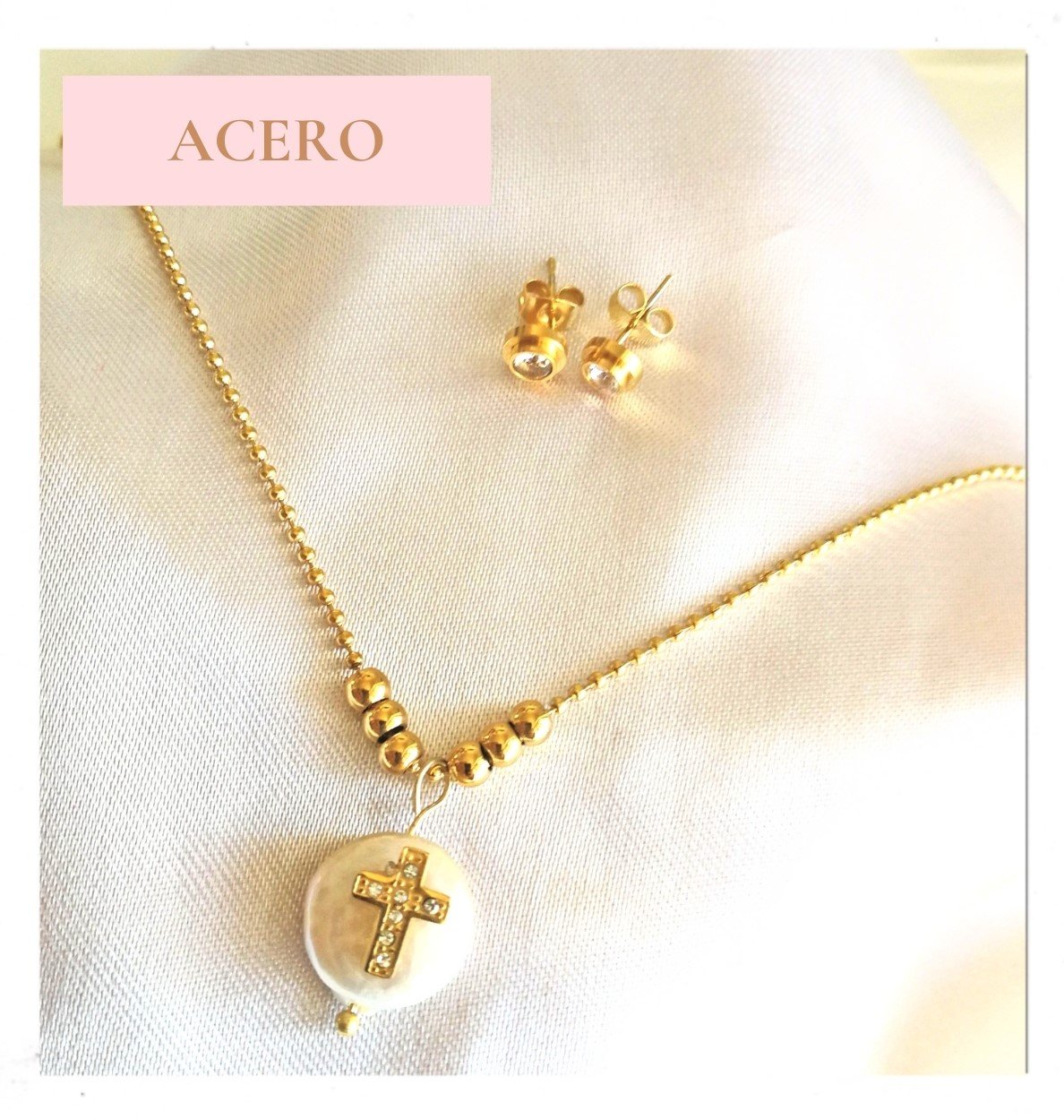JUEGO DE ARETES Y COLLAS DORADO CON DIJE PERLAS CON LA CRUZ EN ACERO