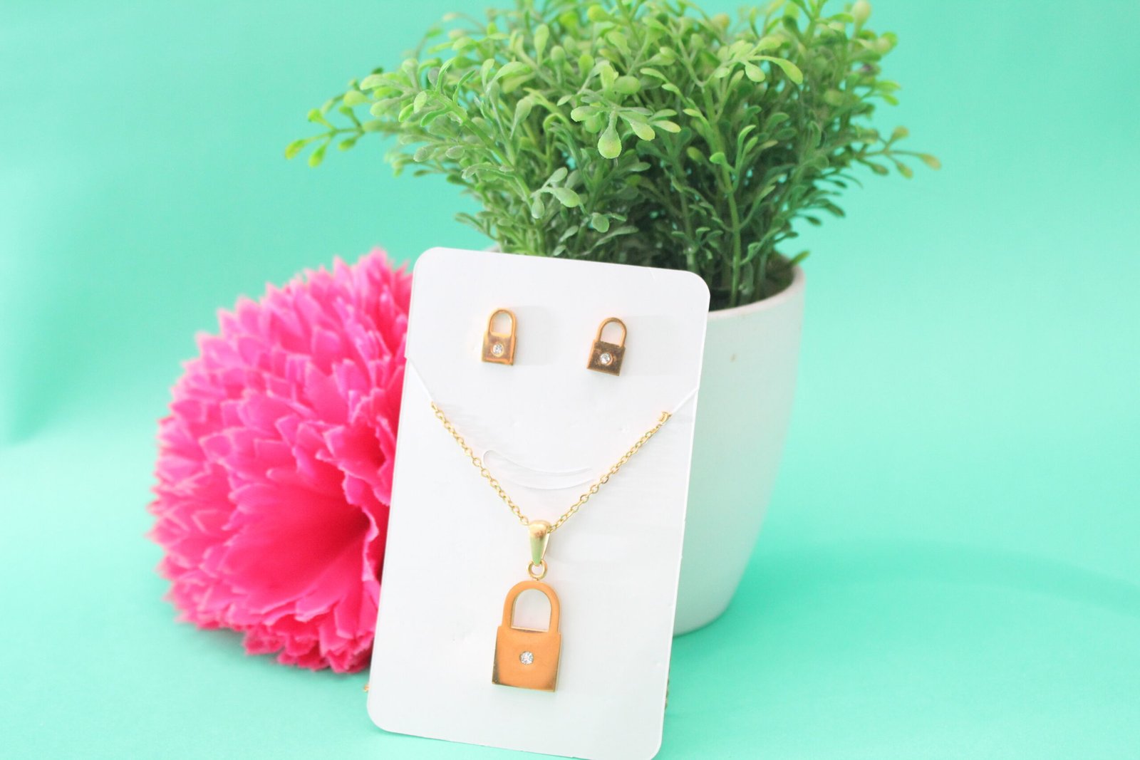 JUEGO ARETES Y COLLAR DORADOS EN ACERO