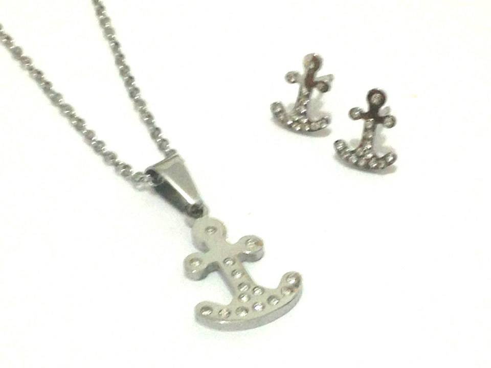 JUEGO DE ARESTES Y COLLAR PLATEADOS EN ACERO CON MOTIVO DE ANCLA