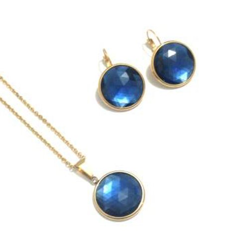 JUEGO DE ARETES Y COLLAR DORADOS EN CON DETALLES EN AZUL DE ACERO