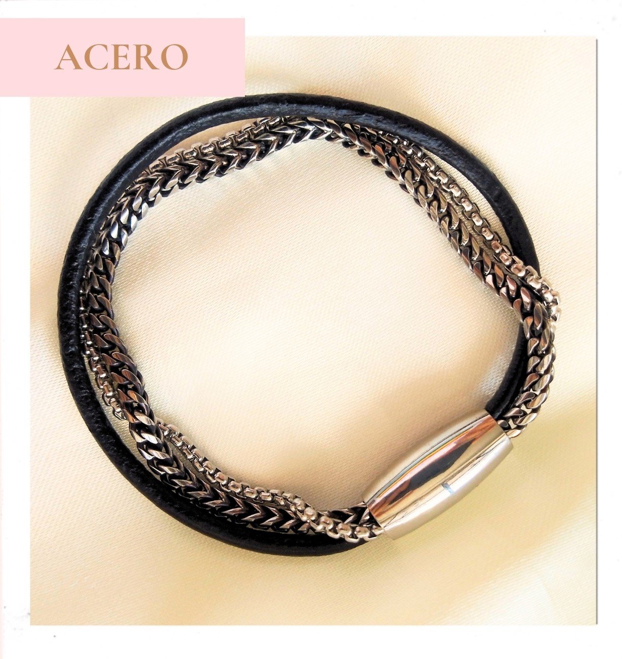 PULCERA CUERO NEGRO Y PLATA EN ACERO