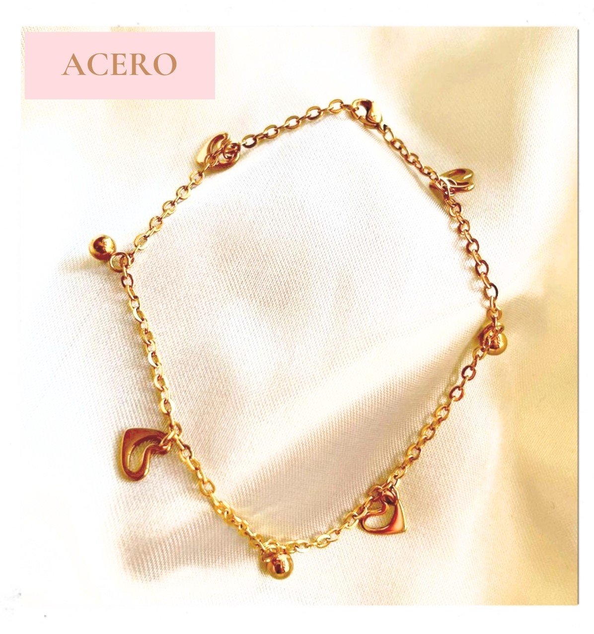 TOBILLERA CON CORAZONES Y PERLAS DORADAS EN ACERO
